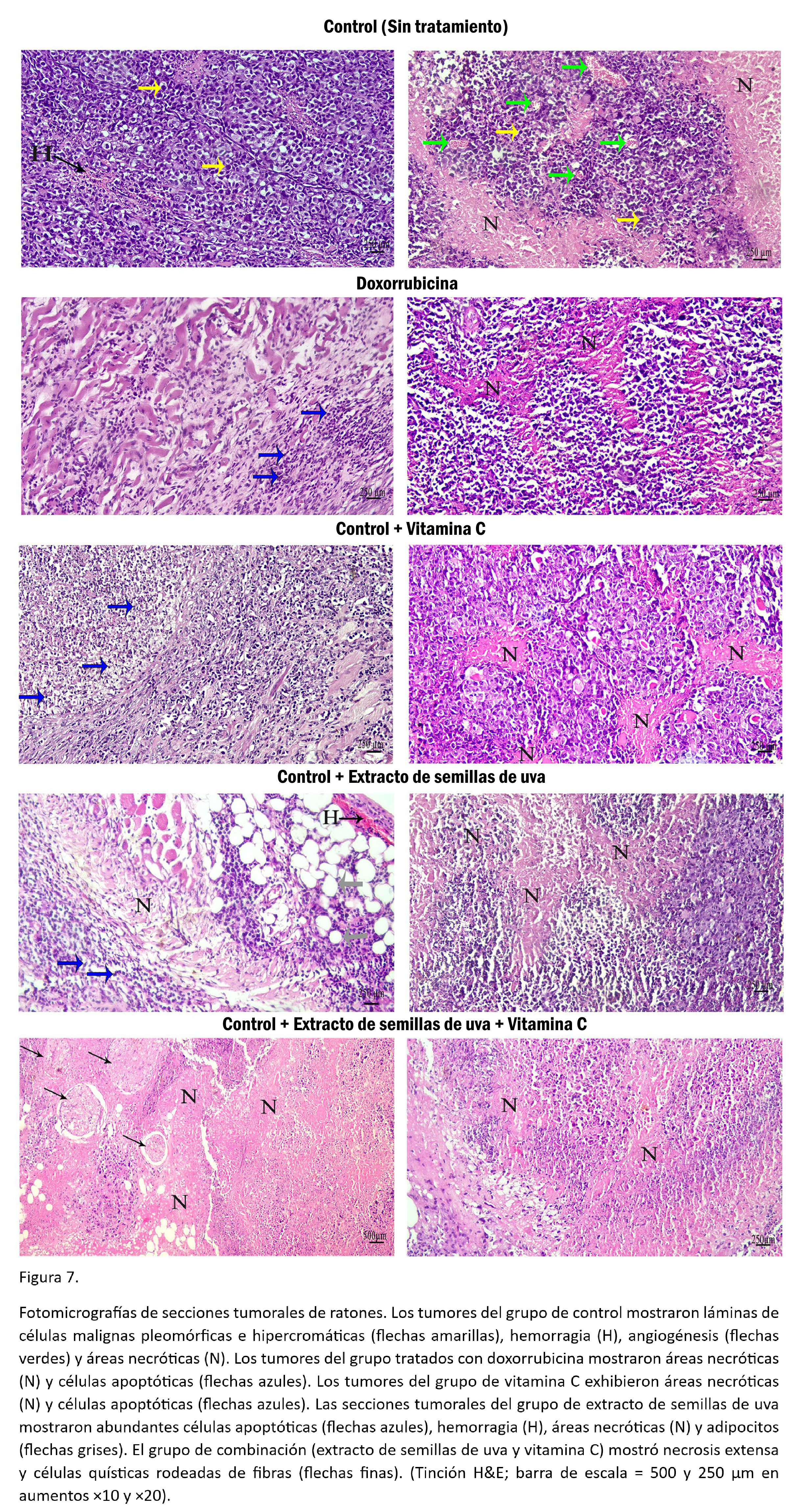 La quimioterapia con doxorrubicina también generó una necrosis considerable, pero lo más llamativo fue la combinación de extracto de semilla de uva y vitamina C: el tumor apareció muy desorganizado, con amplias zonas muertas y apenas quedaban células viables.