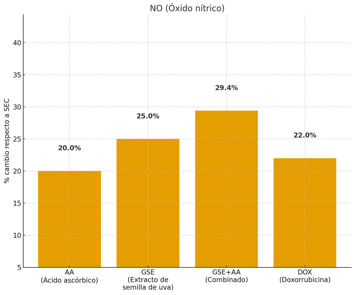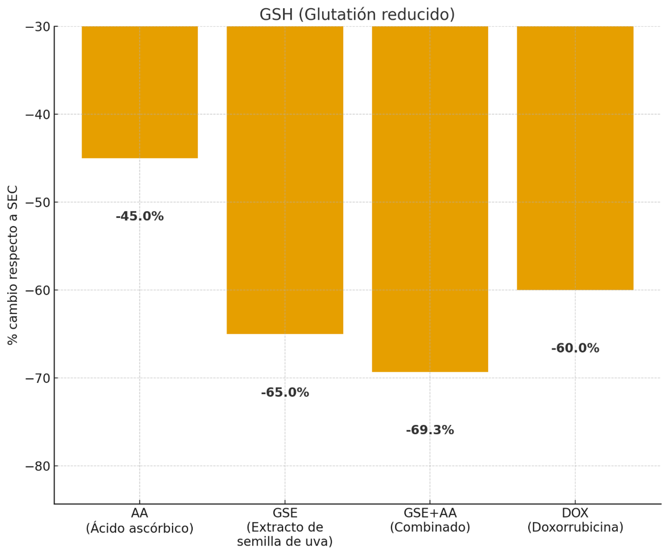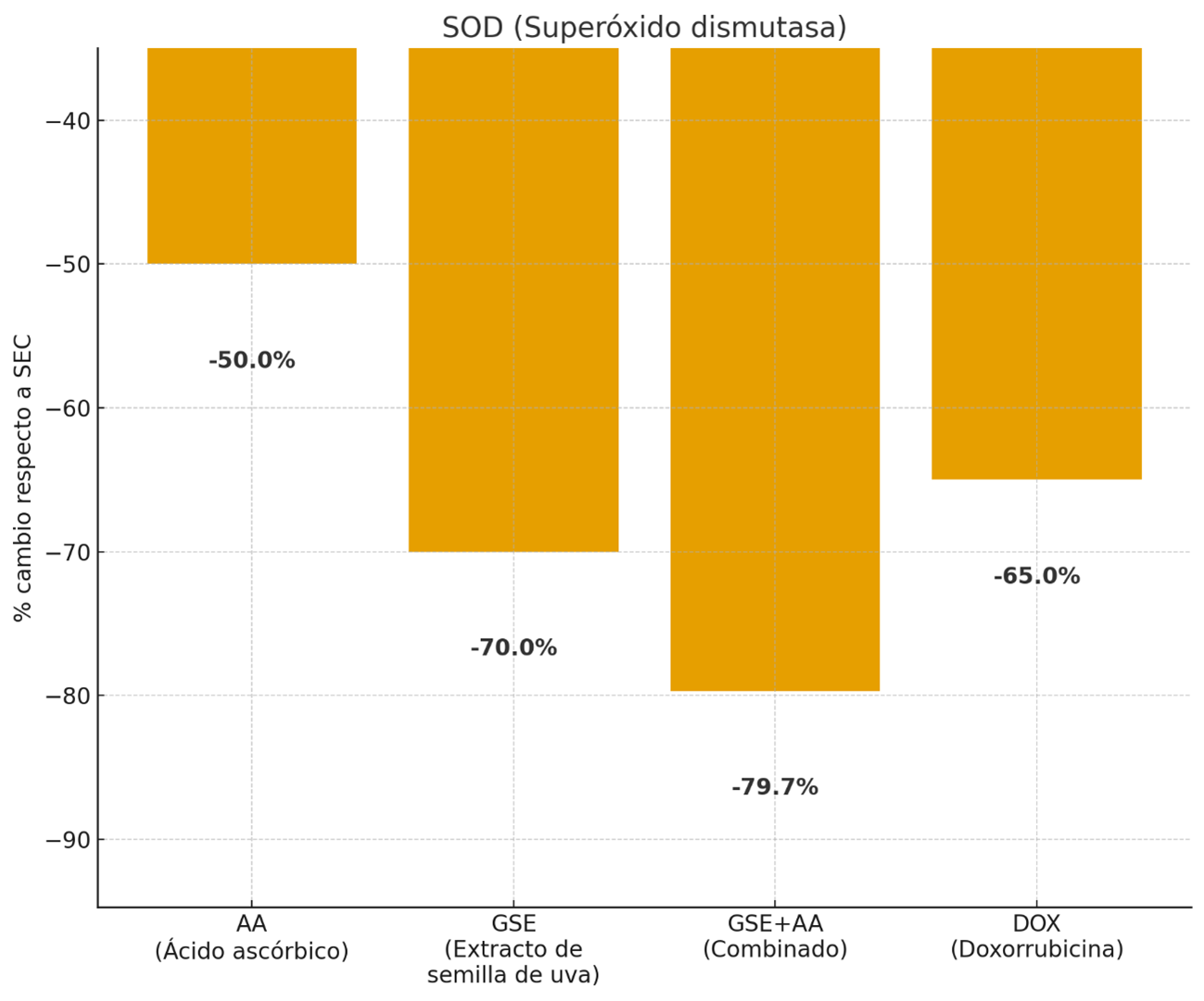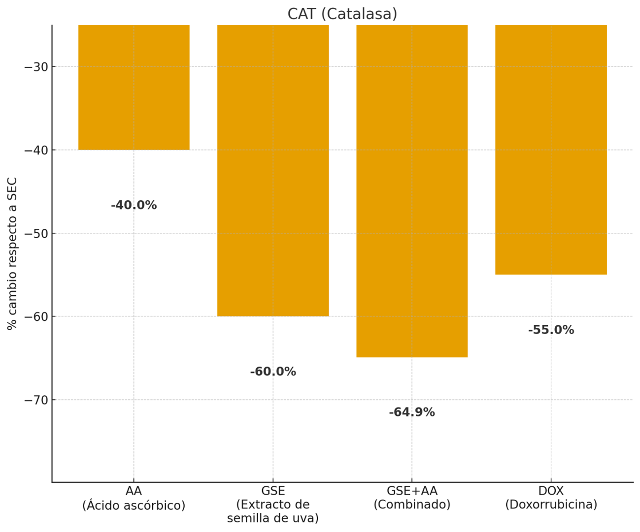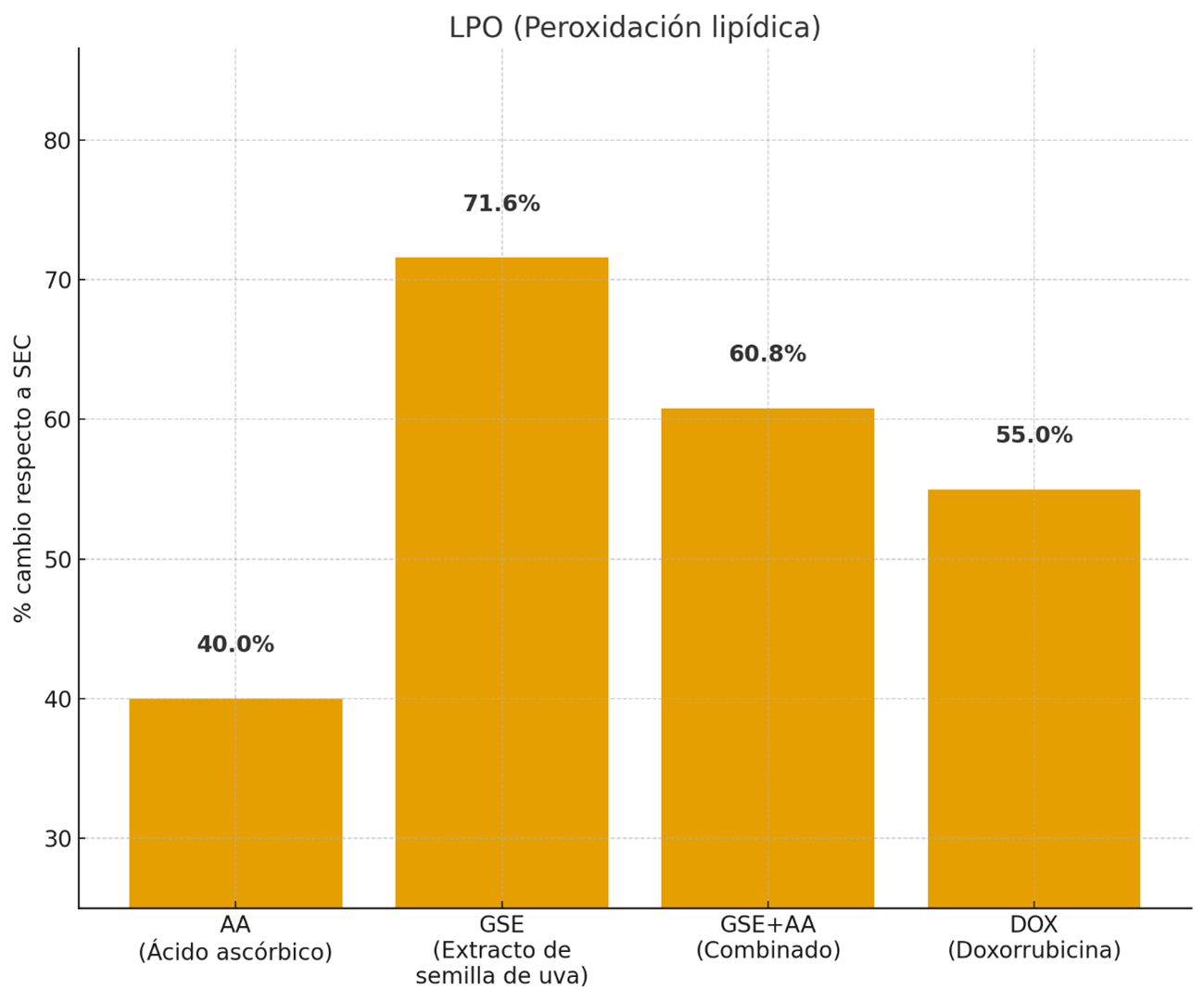 Los resultados mostraron que todos los tratamientos aumentaron los marcadores de daño oxidativo (LPO y NO), especialmente el extracto de semilla de uva solo y en combinación con vitamina C. Al mismo tiempo, se redujeron de forma notable las principales defensas antioxidantes del tumor (SOD, CAT y GSH), lo que significa que las células cancerosas quedaron sin recursos para protegerse del ataque de los radicales libres.
