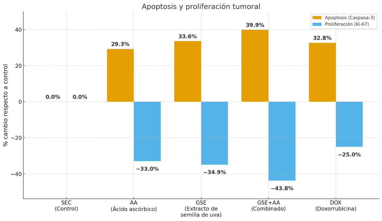 En este estudio, la combinación de extracto de semilla de uva y vitamina C fue la que mejor equilibró estas dos fuerzas: provocó el mayor aumento de apoptosis y la mayor reducción de proliferación. Esto significa que la mezcla no solo detuvo la multiplicación de las células malignas, sino que también favoreció activamente su destrucción, mostrando mejores resultados incluso que la doxorrubicina. Gráfica 2.
