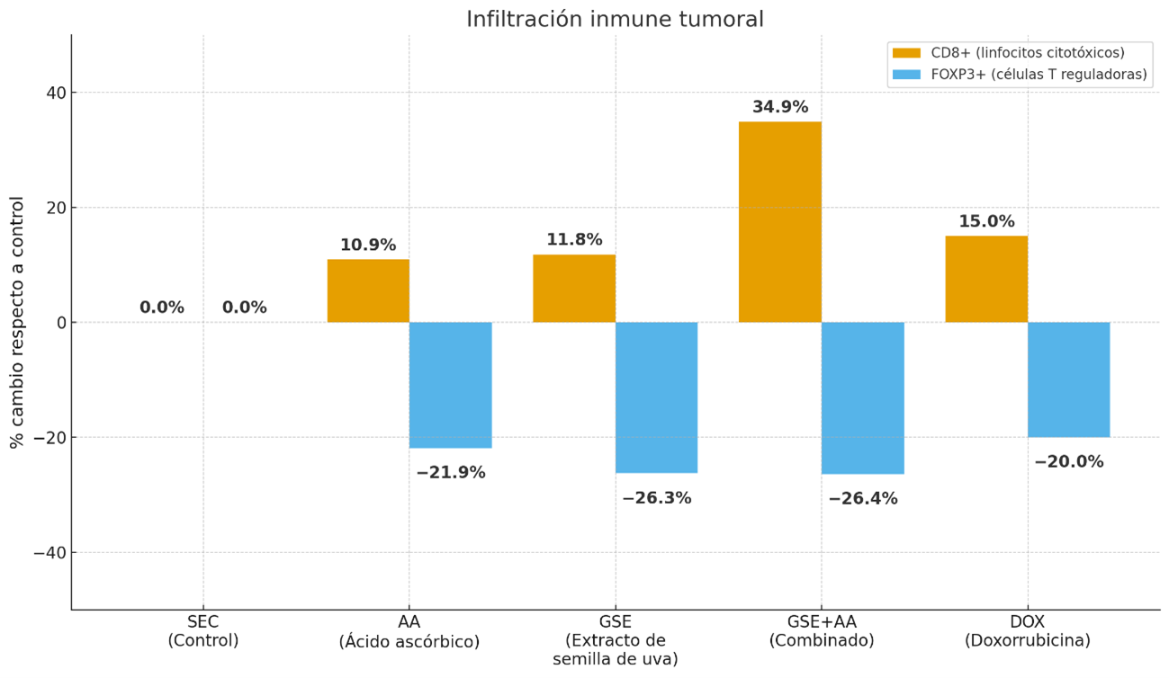 El tratamiento con extracto de semilla de uva y vitamina C, sobre todo en combinación, aumentó con fuerza los linfocitos CD8+ al tiempo que redujo las células FOXP3+. En términos sencillos, el tumor pasó a estar rodeado por más “soldados” listos para combatir y menos “guardianes” que lo protegieran. Este cambio en el microambiente inmunitario reforzó la eficacia de la combinación natural, con resultados incluso más favorables que la quimioterapia con doxorrubicina. Gráfica 3.