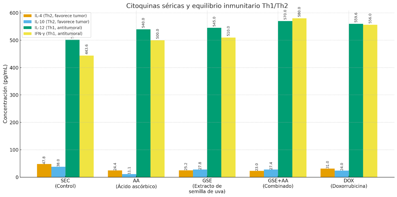 En este estudio se midieron cuatro citoquinas que marcan ese balance: IL-12 e IFN-γ (propias de la respuesta Th1, antitumoral) frente a IL-4 e IL-10 (propias de Th2, protectoras del tumor). El tratamiento combinado con extracto de semilla de uva y vitamina C inclinó claramente la balanza hacia el lado Th1: aumentó los niveles de IL-12 e IFN-γ y redujo IL-4 e IL-10.