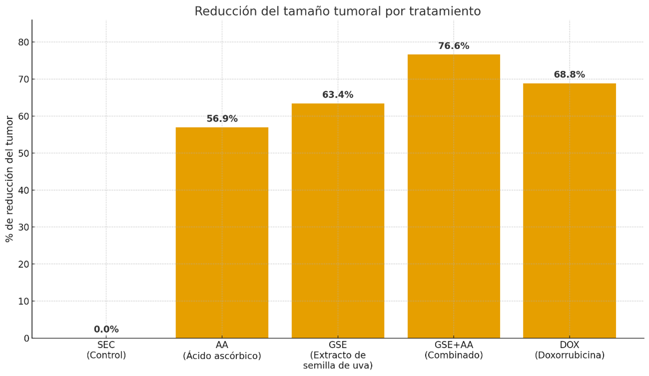 En los ratones del grupo control, el tumor creció sin freno. Sin embargo, tanto la vitamina C (ácido ascórbico) como el extracto de semilla de uva, administrados por separado, consiguieron frenar ese crecimiento de manera notable: la vitamina C redujo el volumen tumoral en un 56,9% y el extracto en un 63,4%. La combinación de ambos tratamientos fue aún más eficaz, alcanzando una reducción del 76,6%, por encima incluso de la quimioterapia estándar con doxorrubicina, que logró un 68,8%. Dicho de forma sencilla, la unión de los dos compuestos naturales no solo detuvo el crecimiento del tumor, sino que lo redujo más que cualquiera de los tratamientos individuales, e incluso más que el fármaco de referencia. Gráfica 1.